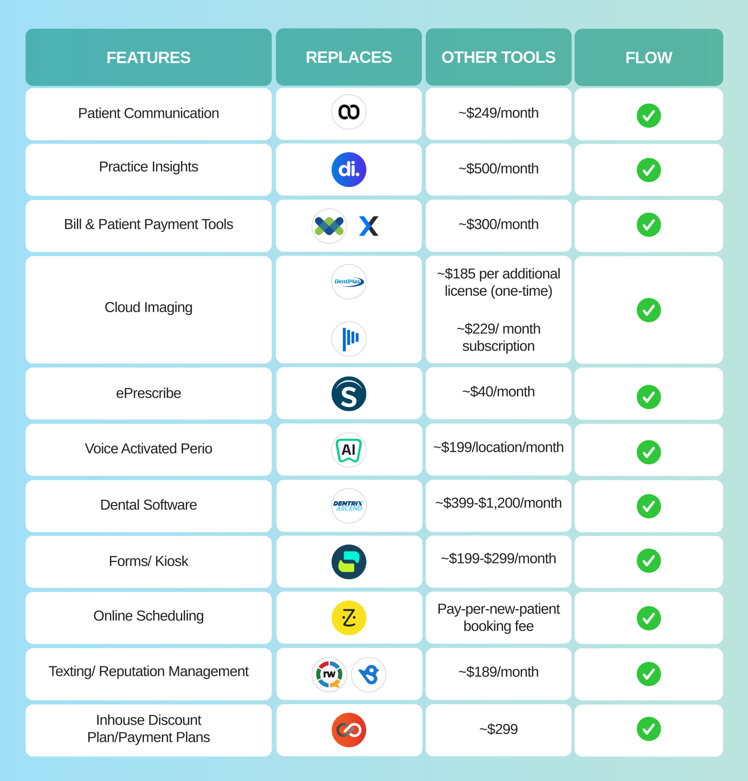 This consolidation simplifies daily workflows, reduces costs, and minimizes points of failure across systems. Everything works together seamlessly, with native functionality, creating a more intuitive and dependable experience. Your practice will benefit from a cleaner tech stack built to grow with your needs. Here's a short list of products Flow can tackle the job of.